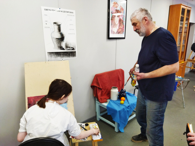 На мастер-класс к Андрею Селенину собрались ребята 12-14 лет. Поскольку опыта работы масляными красками у них не было, художник предложил написать классический натюрморт с кувшином. Селенин, как выяснилось, наш земляк. Жил в Мурманске до 10 лет, а потом переехал с родителями в Керчь. Когда ему сказали, что есть возможность поехать на Север – сразу согласился. Питерский художник отметил, что для юных художников в городе созданы прекрасные условия: мастерские большие, в помещениях много света. Такое в столицах не везде увидишь, не говоря о небольших городах.