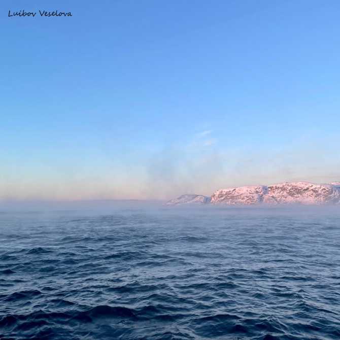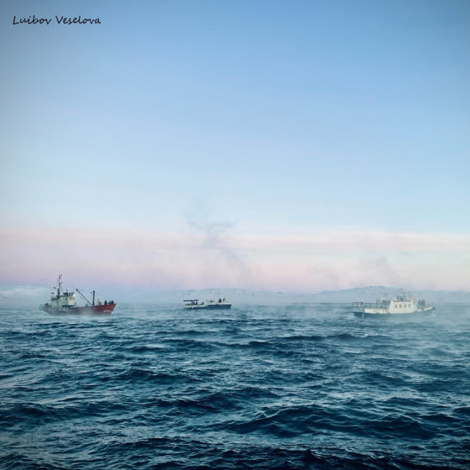 После успешной загрузки группы на борт, вы медленно и неспешно выходите из губы Лодейной в губу Териберскую. Поначалу, кажется, что ваш кораблик единственный во всем этом водном пространстве. Ну разве что на горизонте маячит еще одно судно, но вы его почти не замечаете, наслаждаясь величием волн.