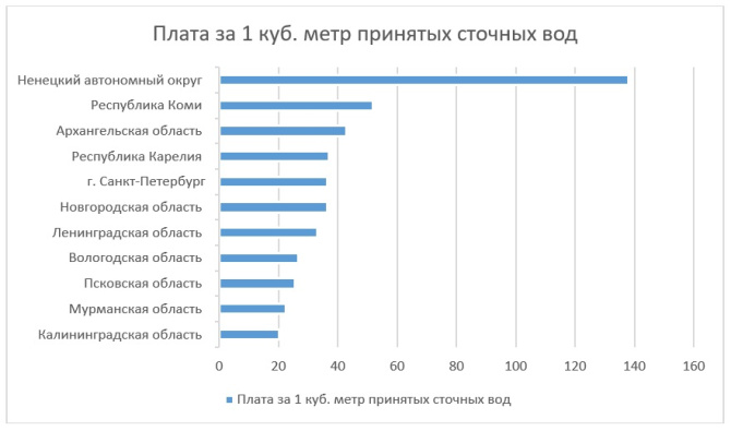 Больше всего за отведение сточных вод платят в Ненецком автономном округе – 138,09 руб./кубический метр. В тройку также вошли Республика Коми 51,79 руб./кубический метр и Архангельская область – 42,82 - руб./кубический метр.