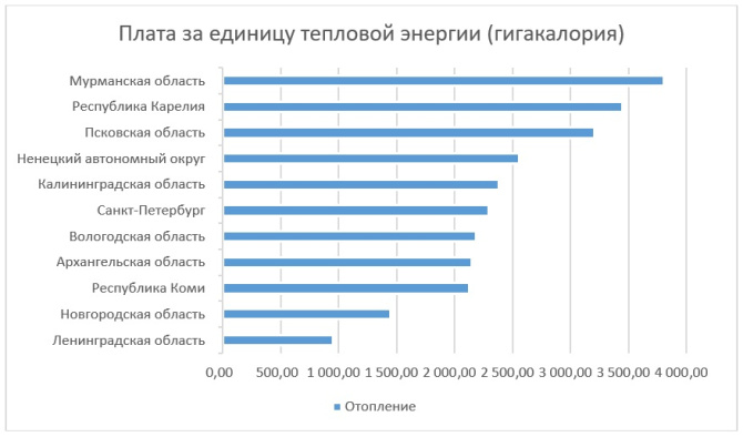 Самое дорогое отопление в СЗФО в Мурманской области. Согласно нормативу, оно составляет 3 804,36 руб./гигакалорию. На втором месте – Республика Карелия: 3 448,82 руб./гигакалория. Тройку самых дорогих регионов занимает Псковская область: 3207,630 руб./гигакалория. Дешевле всего тепло обходится в Ленинградской области – 948,04 руб./гигакалория.
