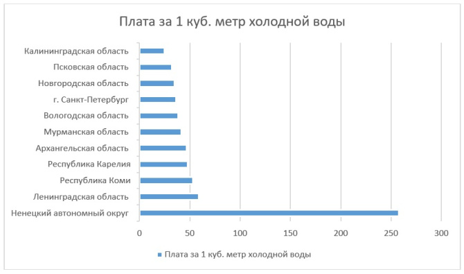 Самая дорогая холодная вода в НАО – 257,76 руб./кубический метр. В ТОП-3 по дороговизне воды также вошли Ленинградская область – 59,05 руб./кубический метр и Республика Коми – 53,09 руб./кубический метр. Дешевле всего холодное водоснабжение обходится жителям Калининградской области – 24,89 руб./кубический метр.