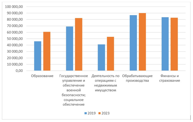 Деятельность по операциям с недвижимым имуществом +11 609,9 рублей за пять лет. В 2019 году средняя зарплата составляла 41 260,4 рублей, а в 2023 – 52 870,3 рублей.