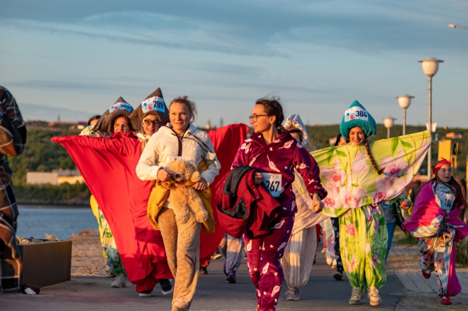 И, действительно, забег стал настолько популярным, что онлайн слоты были полностью выбраны за 8 дней до начала мероприятия. По тому, с какой креативностью северяне подошли к выбору костюмов, можно смело утверждать, что забег они ждали. Здесь были не только простые халаты и разнообразные кугуруми. Некоторые команды сделали тематические костюмы. Так, например, команда «Те самые» бежала в образах подушек и одеял, девушки были награждены за самую многочисленную команду: