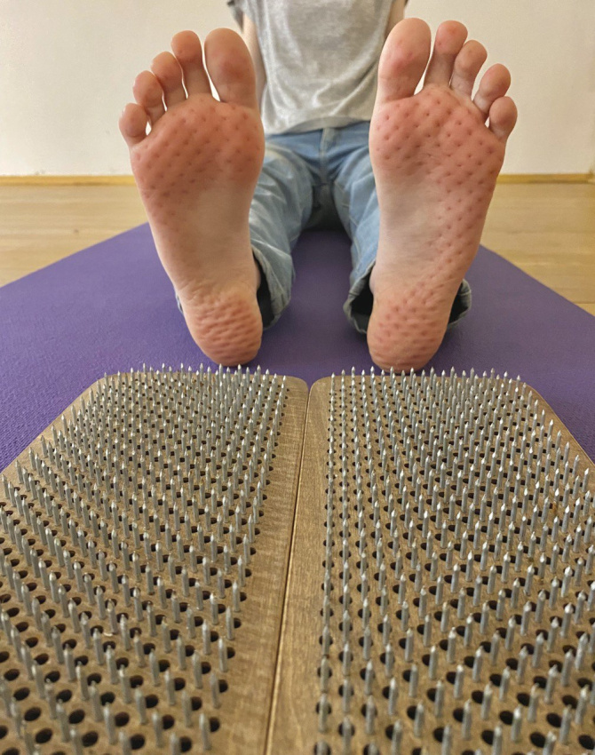 Считаю, что гвоздестояние – слишком категоричная форма йоги. Не у всех причинение боли себе позволяет вырабатывать окситоцин (гормон счастья). Кроме того, у северян из-за постоянного ношения обуви кожа ног более нежная, чем у тех же индийских йогов, которые всю жизнь ходят босиком. Потому я считаю, что лучше использовать другие средства – например, аппликатор Кузнецова. Такие коврики с зубчатыми пластинками советуют врачи для рефлексотерапевтического воздействия на организм.