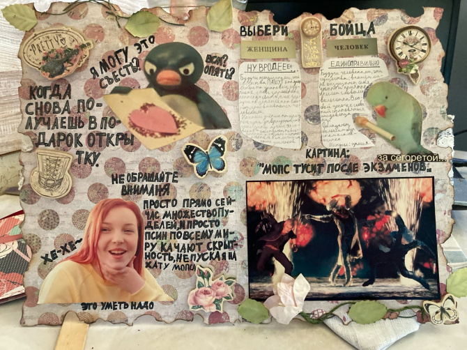 В каждой новой открытке мастерица делает что-то новое: «Раньше это были просто картинки с приколами, после я стала обугливать края, еще я очень люблю интерактивные элементы, которые я делаю текстом, и добавляю разные концовки, чтобы подарок получился оригинальнее, объёмные предметы и прочее. Открытки — это очень доступно, тематик и эстетик неисчерпаемое количество, что удобно, плюс - так ты развиваешь свое воображение».