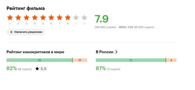 На «Кинопоиске» картина также показывает неплохие результаты: рейтинг 7.9 на основе 267 145 оценок. При этом на IMDb всего 7.5 на основе 66 865 оценок.