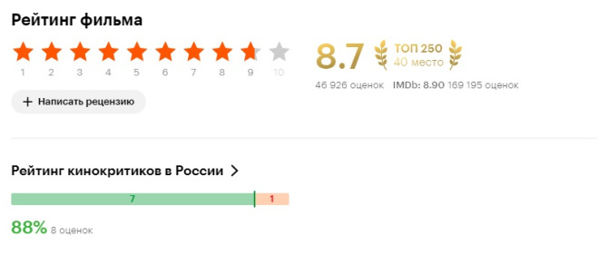 На «Кинопоиске» паучок показывает отличные результаты: рейтинг 8.7 на основе 46 926 оценок! Фильм уже занял 40 строчку ТОП-250. При этом на IMDb оценка еще выше: 8.9 на основе 169 195 оценок.