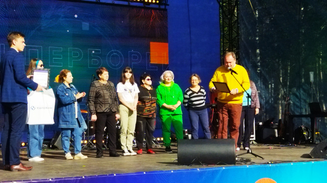 … Конкурсантов чествовали на большой сцене. Дипломы за самые лучшие блюда вручил Владислав Пискунов. Самый красивый гиперборейский пирог приготовила Елена Волкова (та самая ягодная поляна в 3D, в смысле «Румяная ягода»), самый оригинальный – Надежда Черкашина (фигурная рыба-кит с треской и семгой, единственный рыбный пирог на конкурсе) и самый, по мнению жюри, вкусный – Антонина Аплеснина (пирог представил супруг, сама припозднилась, прихорашиваясь). Все участники получили призы от "ЕвроХима".