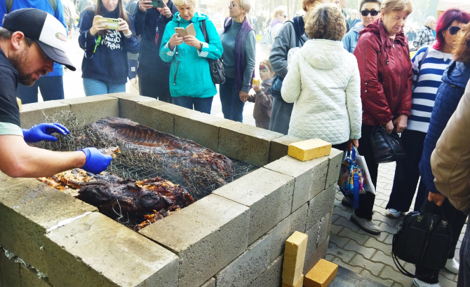 Мастера барбекю-шоу из Подмосковья и Санкт-Петербурга запекали мясо - свинью весом почти 90 кг - в течение 16 часов. Температура на дне импровизированной печи, сложенной на центральной улице из кирпичей, составляла 110 градусов, температура мяса внутри – 90. Такой деликатес можно приготовить только на живом огне. Как признались мастера, поддерживали огонь и присматривали за мясом по очереди. Понятно, чтобы попробовать супер-мясо с перчиком халапеньо, пряным соусом и мексиканским тако, от печки через всю площадь выстроилась очередь.
