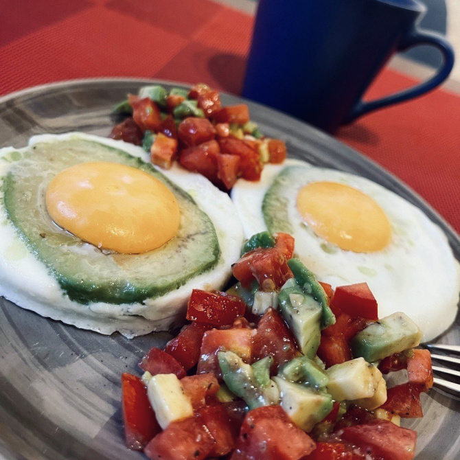Люблю простую глазунью. А если туда добавить еще сыр и сосиски – красота. Недавно открыл для себя рецепт, когда разбиваешь яйцо в авокадо и жаришь. Остатки авокадо можно смешать с помидорами, полить маслом и выложить рядом с авокадной яичницей как гарнир. Очень вкусно.