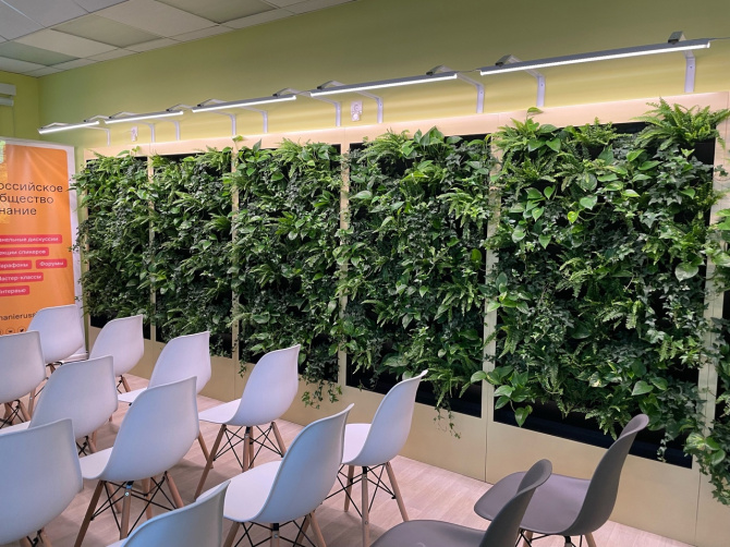 В одном из залов библиотеки расположилась фитостена. Мобильный модуль для вертикального озеленения на основе прочной конструкции с ячейками для высадки живых растений.