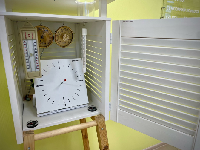 Прямо на входе вас встречает метеостанция. Здесь есть минимальный набор оборудования для фиксирования погоды: градусники для помещения и улицы, барометр, гигрометр, компас, солнечные часы и устройство для определения скорости и направления ветра. Метеостанция пока стоит в помещении, но с приходом весны займет почетное место на улице.