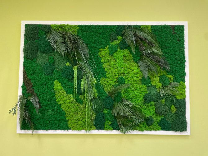На территории всей библиотеки привлекают внимание панно из стабилизированного мха - островки буйной зелени на стенах.
