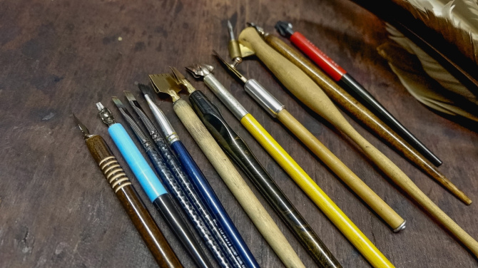 — У меня огромное количество инструментов. Каллиграфия, именно почерки, еще различается по инструментам. Есть две большие группы – плоское перо и острое перо. Соответственно к ним можно отнести плоскую кисть, простую кисть и так далее.