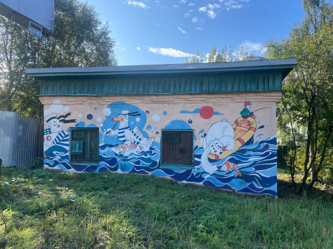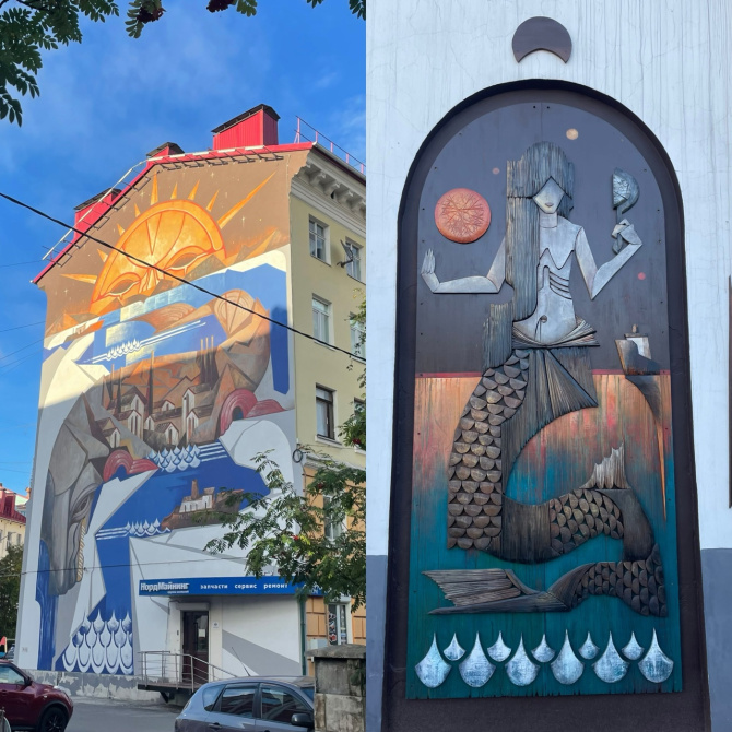 После сквера сверните на улицу Профсоюзов, на доме №1 можно полюбоваться на деревянное панно «Морская дева», а с другой стороны здания нарисован мурал «Восход» Кирилла Ведерникова, попавший в топ-10 объектов, которые обязательно нужно увидеть в путешествии по Мурманску по версии популярного сервиса бронирования билетов.