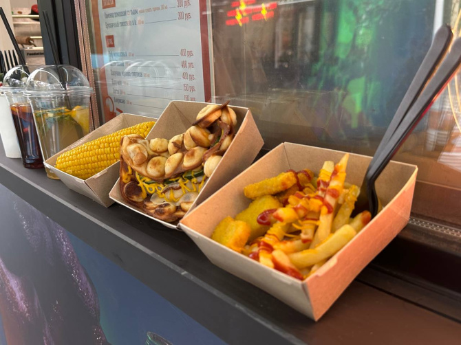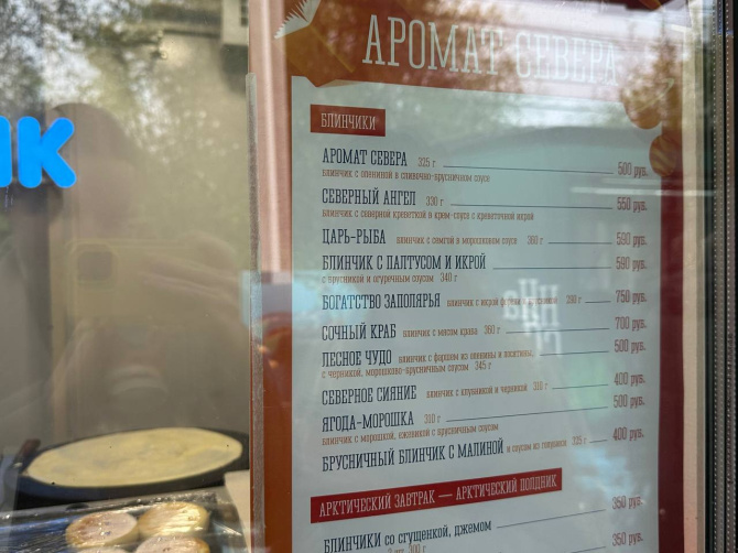 Сувениры посмотрели и отправляемся за едой. Тем более, в дождливую погоду горячий кофе или ароматный чай будет особенно кстати. Стоимость кофе – от 100 рублей за американо до внушительных 450 за напиток с молоком и сиропами. Есть предложения и из меню арктической кухни, так, блинчик с креветкой вы можете приобрести за 550 рублей.