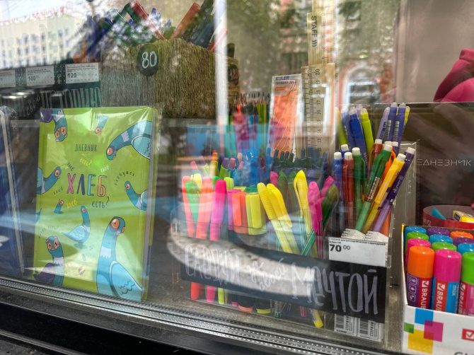 Ларек с канцтоварами на ярмарке только один. Цены в нём выше, чем в магазинах в Мурманске. Так, шариковая ручка обойдется в 120 рублей.