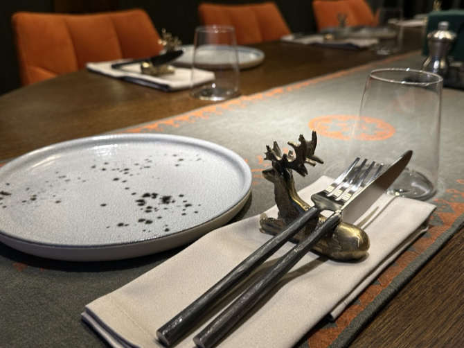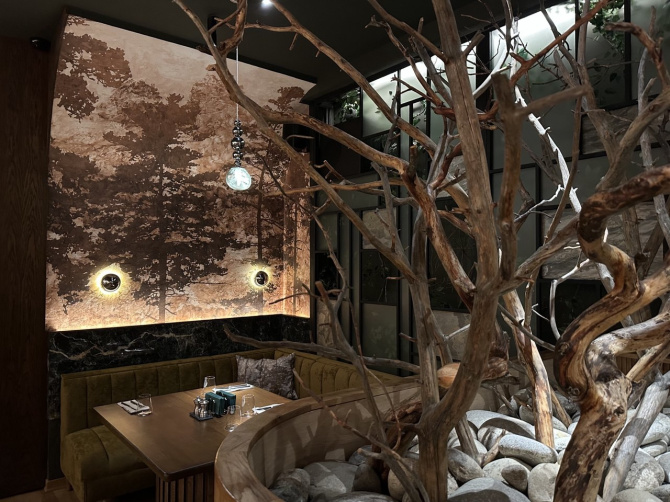Эстетика арктической природы отражена в каждой детали нового ресторана MOSS в Мурманске. Пейзажи северного леса на стенах, зеркала, напоминающие бесчисленные заполярные озера, нарисованные углём и соусом олени, имитация ягеля на стенах и даже олени-подставки под столовые приборы, сделанные вручную на заказ.