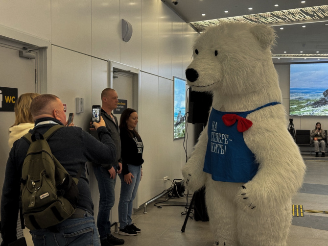 Поприветствовал гостей региона и артист в ростовой кукле белого медведя.