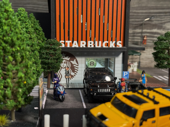 Все модели машин, которые украшают диорамы, маленькие — их размер 1:64, поэтому и фигурки людей тоже миниатюрные — примерно 26 миллиметров. Это размер скрепки.