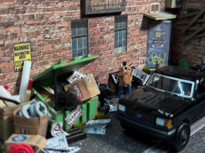 В каждую из диорам нужно внимательно вглядываться, чтобы не упустить интересные элементы: витрины магазинов, коробки от техники, кондиционеры, объявления, постеры и граффити на стенах, газеты, разбросанные на земле, мусор, деревья, кусты.