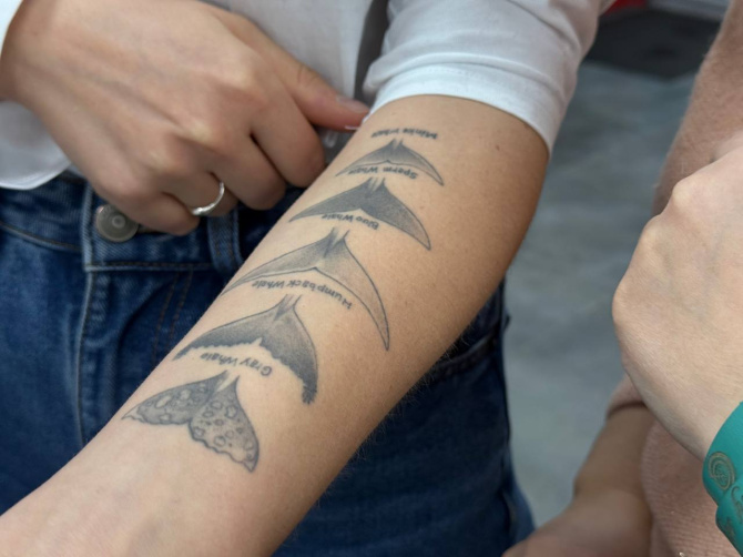 Как же эксперты определили, что к берегу приплыл именно тот самый Станислав? Как рассказала гостья «Большого Радио», идентифицировать каждого отдельного горбатого кита легко — по хвосту. И доказала это Анастасия журналистам буквально с помощью руки —у неё есть татуировка, с помощью которой она объясняет и показывает интересующимся, что хвосты у этих крупных млекопитающих индивидуальны, как отпечатки пальцев у человека.