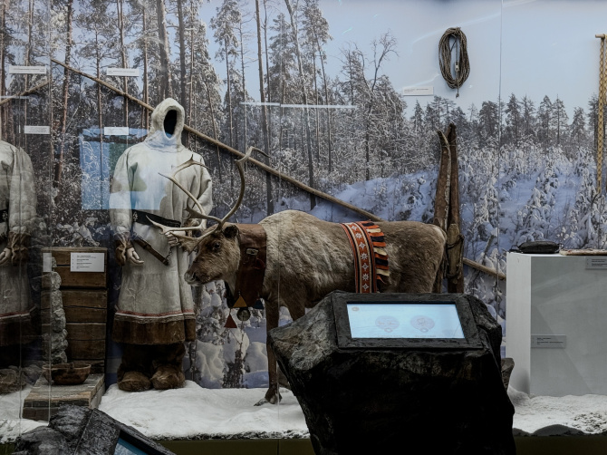 Соседствующий зал дышит культурой коренного народа – саамов. Их жизнь, неотделимая от природы, оленеводства, охоты и рыболовства, предстаёт в традиционных костюмах, предметах быта и целых погостах. Особое очарование – инвентарь и одежда, сшитая из оленьей шкуры.