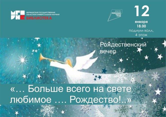 Мурманская областная научная библиотека приглашает жителей областного центра 12 января на Рождественский вечер. В программе участвуют учащиеся театральной студии «Катарсис» Дома детского творчества имени Александра Торцева под руководством Татьяны Малковой и руководитель отдела культуры Мурманской епархии Тимофей Пискунов. На вечере прозвучат стихи и проза из произведений русских классиков, посвященные празднованию Рождества Христова.