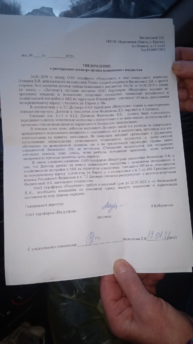 «Согласно п.п. 4.1.1 и 4.1.2 Договора Филиппова Л. К. должна была использовать переданное в аренду недвижимое имущество в соответствии с их назначением, документацией и правилами, обеспечивающими их нормальную и безопасную эксплуатацию. Однако своих обязанностей Филиппова Л. К. не исполнила (помещение используется для содержания собачьего приюта, окна, стены, полы разбиты, помещение загазовано, везде собачьи экскременты, проходы завалены, грязь, сырость)», - гласит уведомление о расторжении договора аренды.