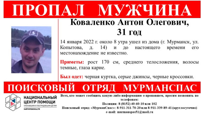 14 января 2022 года ушел из дома (Мурманск, ул. Копытова, д. 14) и до настоящего момента его местонахождение неизвестно.