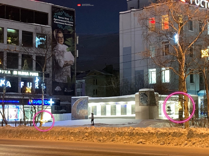 Штормовой ветер в Мурманске не только сгибает дорожные знаки, но и «снимает» звезды с деревьев. Очевидцы сообщают, что световые украшения в виде звезд сорвало ветром с веток деревьев, которые расположены в Центральном сквере на проспекте Ленина (ближе к Пушкинской улице).