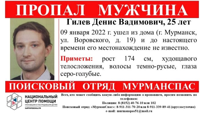 25-летний мурманчанин Денис Гилев ушел из дома №19 по улице Воровского 9 января. До сих пор его местонахождение неизвестно.
