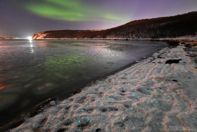 В начале декабря прошлого года на берегу сотрудники Беломорской биостанции МГУ обнаружили светящийся синим снег.