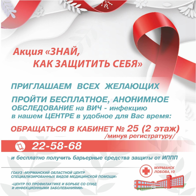 «Мурманский областной Центр специализированных видов медицинской помощи» приглашает жителей областного центра принять участие в акции "Знай, как защитить себя" и бесплатно пройти обследование на ВИЧ-инфекцию. Процедура обследования анонимная и бесплатная для всех категорий граждан. Также участникам акции будут выданы барьерные средства защиты от инфекционныз заболеваний, передающихся половым путём.