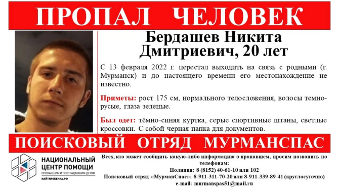 Волонтёры поискового отряда "МурманСпас" обращаются к северянам за помощью в розыске Никиты Дмитриевича Бердашева. Молодой человек с 13 февраля перестал выходить на связь с родными, и до настоящего времени его местонахождение неизвестно.