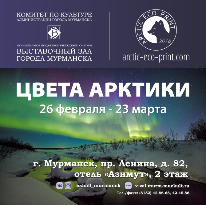 Выставочный зал города Мурманска приглашает северян посетить фотовыставку под названием «Цвета Арктики». Фотопроект «Арктик Эко Принт» объединил пятерых фотохудожников Дмитрия Дешевых, Александра Меркушева, Виталия Новикова, Ирины Прокопчук и Александра Рогачёва, для которых арктическая тема - главенствующая в их творчестве.
