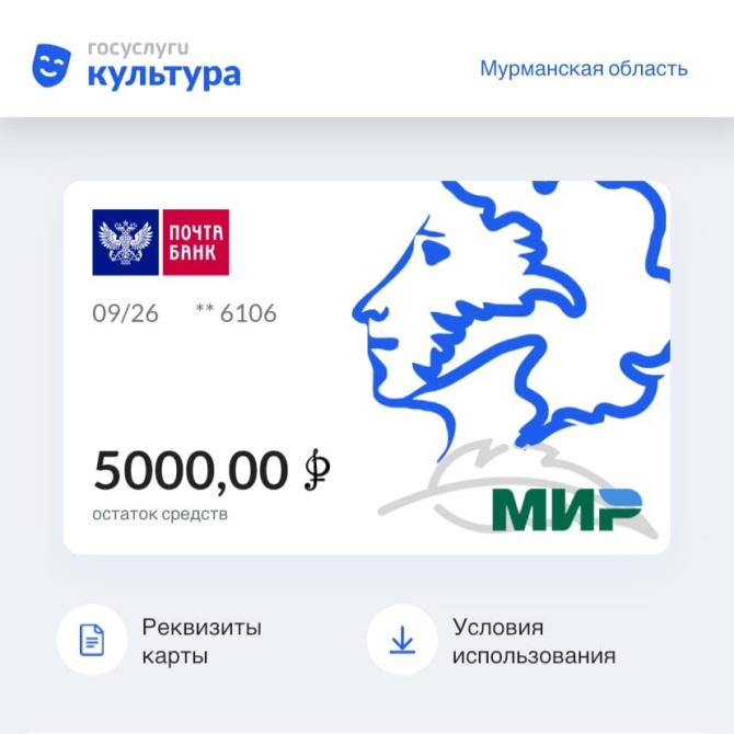 В кинотеатре «Мурманск» также добавили «Пушкинская карта» дает право на покупку билетов только на те фильмы, которые были созданы при поддержке Министерства культуры Российской Федерации и (или) Федерального фонда социальной и экономической поддержки отечественной кинематографии. Список доступных в рамках проекта фильмов опубликован на сайте PRO.Культура.РФ.
