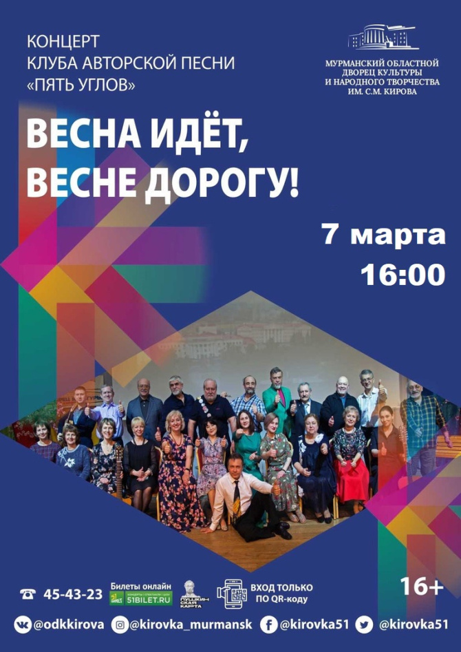 В преддверии международного женского дня во Дворце культуры и народного творчества имени Кирова состоится концерт «Весна идёт, весне дорогу!», на который зрителей приглашает клуб авторской песни «Пять углов».