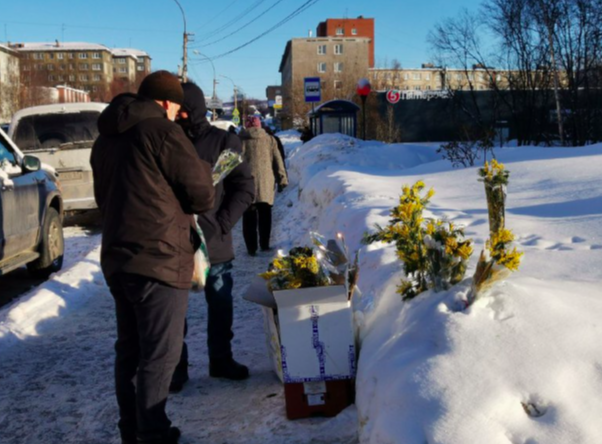 На улицах Мурманска появились продавцы мимозы. Коробки с желтыми весенними цветами выставлены на оживленных перекрестках города.