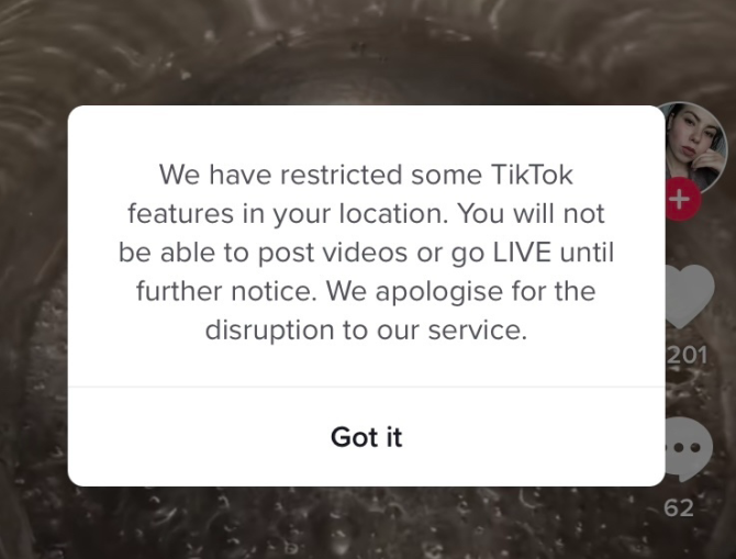 TikTok ограничил работу в России из-за закона о «фейках». Недоступны стримы и загрузка нового контента. При открытии TikTok пользователей предупреждают об ограничениях, действующих на территории страны.
