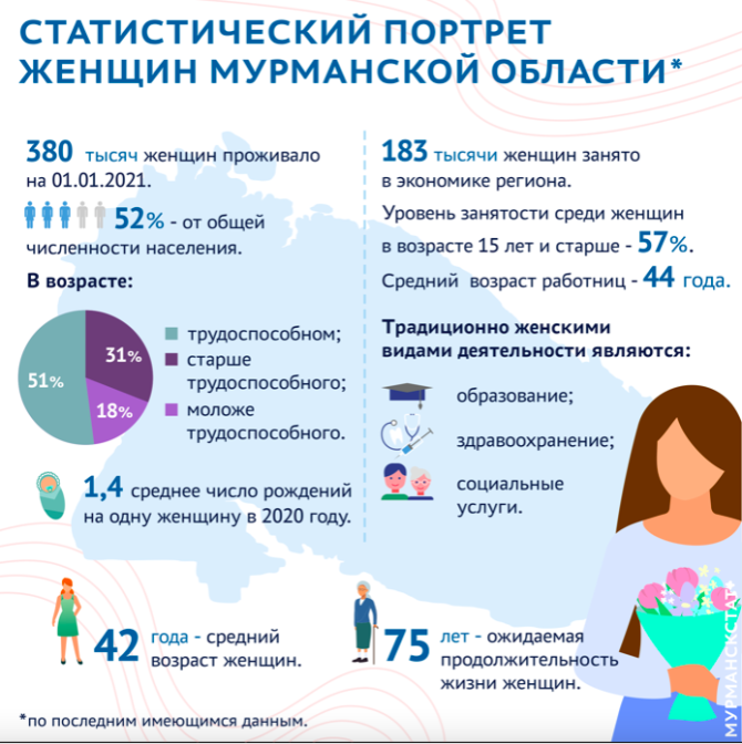 По последним имеющимся данным, в Мурманской области проживает 380 тысяч северянок, что составляет 52% от общей численности населения.