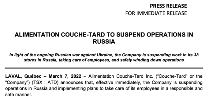 Alimentation Couche-Tard Inc., известная в России как Circle K, приостанавливает свою деятельность в Санкт-Петербурге, Мурманске и Пскове, сообщается на сайте компании.