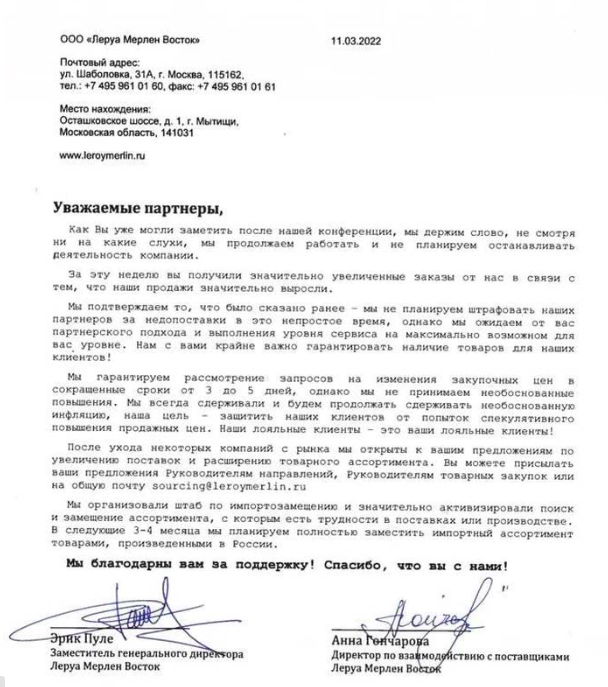 «Несмотря ни на какие слухи, мы продолжаем работать и не планируем останавливать деятельность компании. Мы ожидаем от вас партнерского подхода и выполнения уровня сервиса. Нам с вами крайне важно гарантировать наличие товаров для наших клиентов», - говорится в письме партнерам ритейлера.