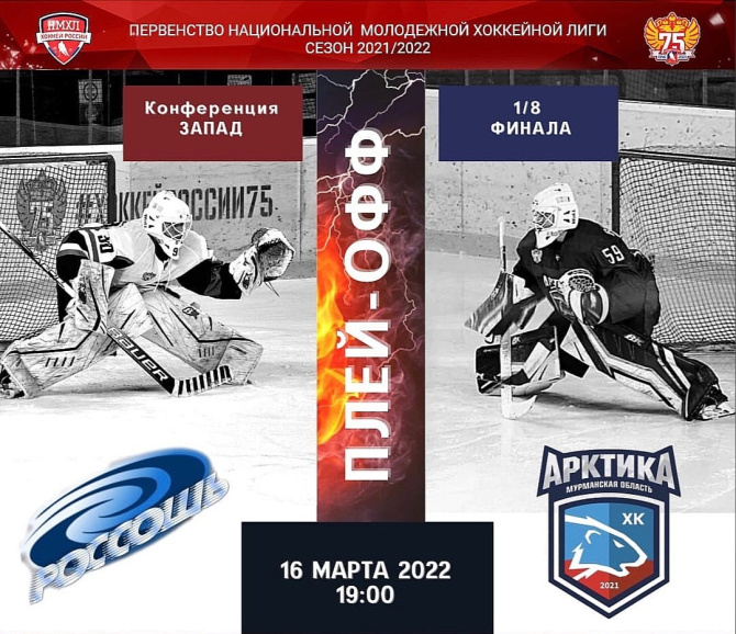 Мурманская команда «Арктика» приглашает болельщиков на первую домашнюю игру Первенства национальной молодёжной хоккейной лиги Западной конференции в серии плей-офф.