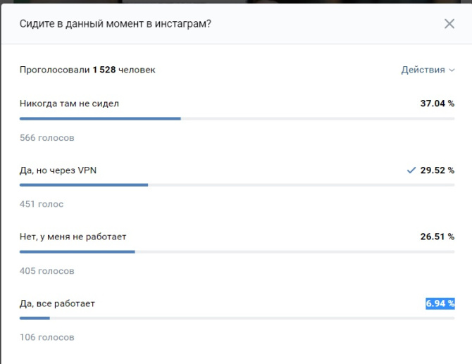 Как отметили 26.51% опрошенных северян, у них Instagram перестал работать вообще, а у 6.94% приложение функционирует без перебоев.