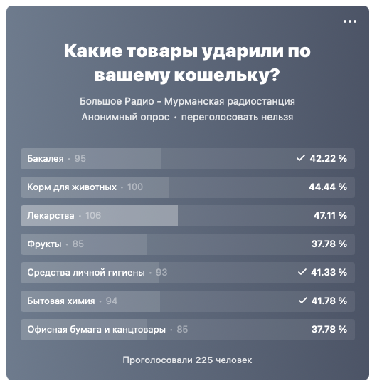 На вопрос Большого Радио, что сильнее ударило по кошельку, почти половина северян выбрала лекарства. 42% опрошенных отметили рост цен на бакалею (сахар в том числе). На третьем месте - корма для животных (44%).