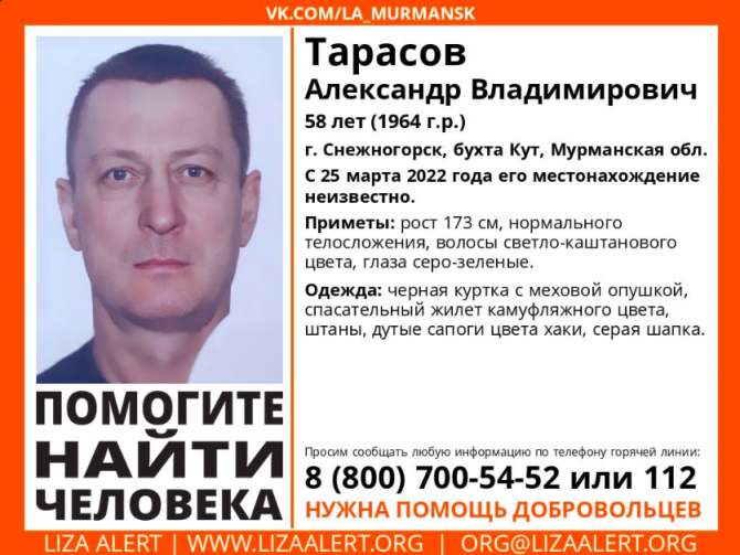 В Снежногорске, бухта Кут ищут 58-летнего Александра Тарасова. С 25 марта его местонахождение неизвестно, сообщает поисковый отряд «ЛизаАлерт».