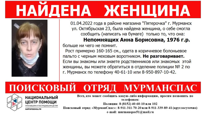 Сегодня в районе магазина «Пятерочка» на улице Октябрьская, 23 в Мурманске была найдена женщина. Как сообщили волонтеры поискового отряда «МурманСпас», о себе она смогла сообщить (написать на бумаге) только имя и год рождения – Непомнящих Анна Борисовна, 1976 года рождения. Больше ничего не помнит.