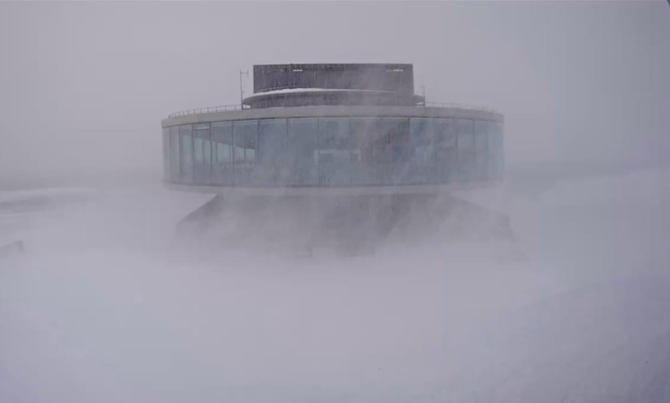На онлайн-трансляции «Большого Вудъявра» видно как бушует ветер на вершинах Северного и Южного склонов. В Мурманске пока спокойно, облачно, временами легкий снег.