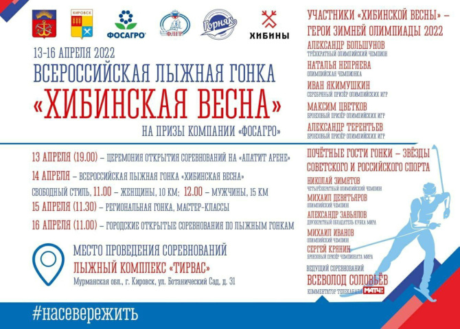В «Хибинской весне 2022» примут участие трехкратный Олимпийский чемпион, двукратный обладатель Кубка мира Александр Большунов; олимпийская чемпионка в эстафете, трёхкратный призёр Олимпийских игр Наталья Непряева; серебряный призёр Олимпийских игр Иван Якимушкин; бронзовый призёр Олимпийских игр биатлонист Максим Цветков, двукратный бронзовый призёр Олимпийских игр в Пекине Александр Терентьев и другие известные спортсмены.